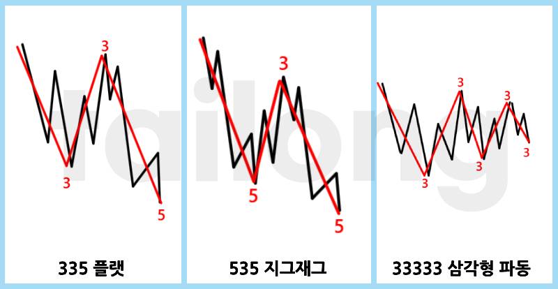 엘리어트 파동이론의 조정파동은 단순 조정파동과 복합 조정파동이 있습니다. 여기에서는 단순 조정파동인 335 플랫, 535 지그재그, 33333 삼각형 파동에 대해 다루도록 하겠습니다. 위 그림 좌측은 335 플랫, 중앙은 535 지그재그, 우측은 33333 삼각형 파동입니다.