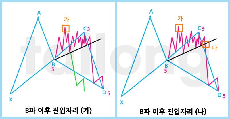 위 그림) 과 같이 B파에서 C파가 진행될 때 나오는 빨간색 네모와 같은 숏포지션 진입 자리가 나오고,