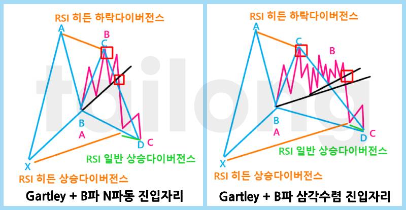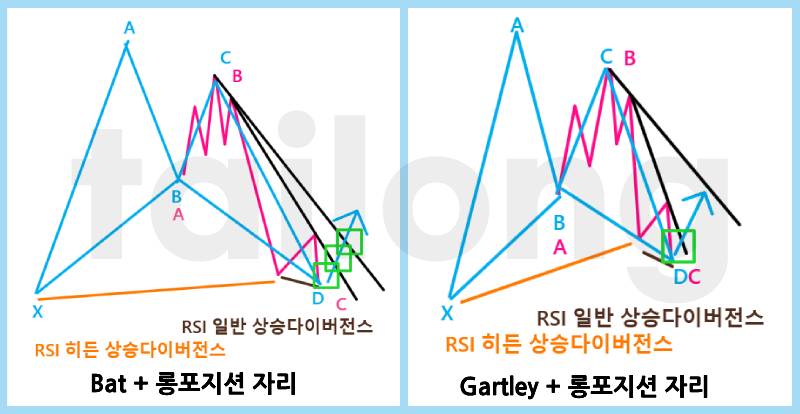 그리고 Bat Pattern에 표시하진 않았지만, Bat Pattern과 Gartley Pattern은 모두 하모닉 패턴 X포인트와 조정파동 C-3파 자리에서 RSI 히든 상승다이버전스가 나오고, C-3파와 C-5파에서 RSI 일반 상승다이버전스가 나옵니다. 그래서 하모닉 패턴 PRZ(D, AB=CD, BC Projection)과 ABC 조정파동 마무리, RSI 다이버전스를 결합해서 보면 안정적으로 진입자리를 찾아볼 수 있죠.