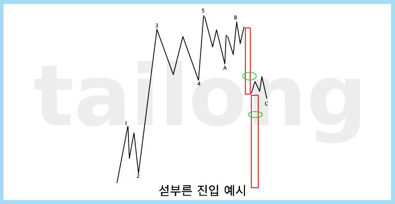 여러 케이스가 있겠지만, 위 그림 좌측 ) 과 같이 C파 장대음봉이 나오는 구간에서 섣불리 매수하게 될 경우, C-3파가 끝날 때까지 기다려야함은 물론이고 C-5파가 종결됨도 기다려야합니다. 또한 빠르게 진입했을 경우 이 반등이 진입자리까지 오지 못할 경우도 있어요.