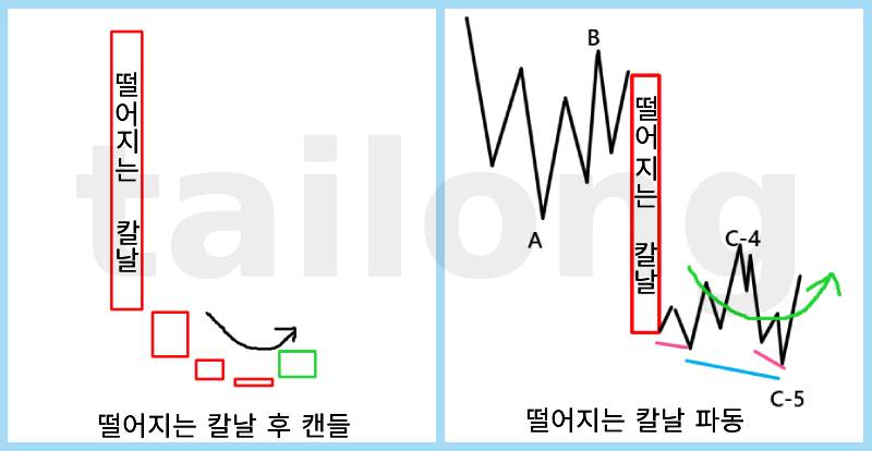 적당한 낙폭으로 하락하는 것을 떨어지는 칼날이라고 하진 않으며, 4시간 봉이나 일봉상에서 확연히 보일 정도의 '급락'이 진행되는 경우를 떨어지는 칼날이라고 부를 수 있다고 생각하며 이런 자리는 보통 엘리어트 파동이론의 충격파동 3파 혹은 그 이후에 해당하는 경우가 많습니다.