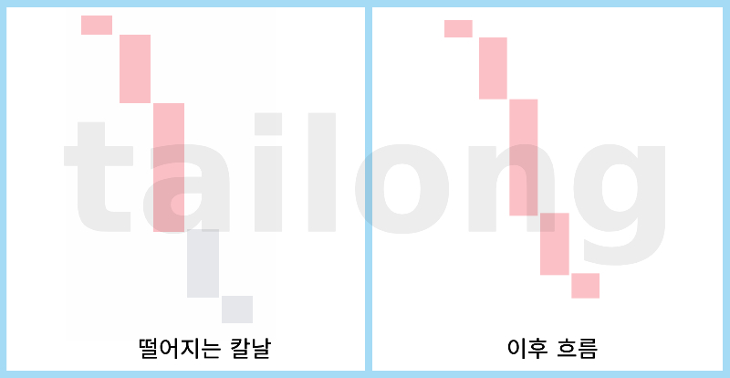 떨어지는 칼날은 '장대음봉'이라는 전제조건이 있습니다. 떨어지는 칼날은 상승추세이던 강세장에서 단기건 중장기건 하락추세로의 전환 이후 하락이 강화될 때 나오는 특정한 패턴으로 생각해볼 수 있습니다.