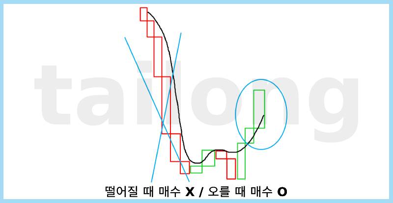 위 그림) 과 같이 우리는 떨어질 때 매수하지 않고, 떨어진 후 오르기 시작할 때 매수해야합니다.