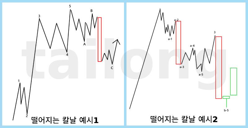 적당한 낙폭으로 하락하는 것을 떨어지는 칼날이라고 하진 않으며, 4시간 봉이나 일봉상에서 확연히 보일 정도의 '급락'이 진행되는 경우를 떨어지는 칼날이라고 부를 수 있다고 생각하며 이런 자리는 보통 엘리어트 파동이론의 충격파동 3파 혹은 그 이후에 해당하는 경우가 많습니다.