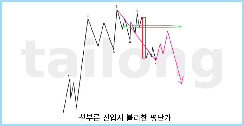 장대음봉에서 '상대적으로 저렴한 가격'이라고 매수하거나, 어설프게 엘리어트 파동이론이나 기술적분석 근거를 취합해서 조정이 마무리될 것이라고 지레짐작하는 경우 위 그림의 위쪽 초록색 동그라미에서 진입할 수 있게 됩니다.