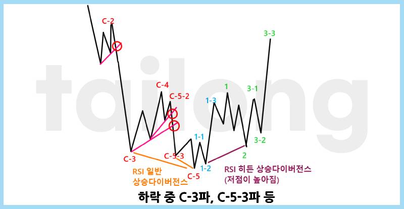 이후 1-2파 저점(C-5파인 경우도 있음)와 2파 저점간에 RSI 히든 상승다이버전스( RSI 일반 상승다이버전스가 나올 때도 있음 )가 나오면서 저점이 높아지며 눌림목 형성 후 상승합니다. 이때도 주황색으로 표시한 3-1파의 하위파동 3-1-3파에서 거래량이 증가하며 상승하죠. 마지막으로 큰 역헤드앤 숄더인 C-4파와 1파의 넥라인을 상향돌파하는 3-3파에서 거래량이 급증합니다.