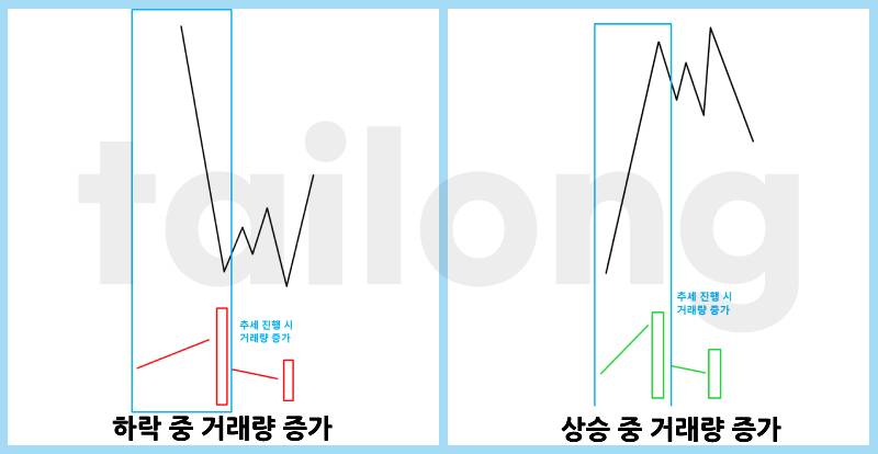 위 그림 우측) 은 상승추세가 지속되는 중 거래량이 증가하며, 이후 횡보조정을 하며 거래량이 감소하죠. 하락은 이와 반대로 적용하시면 됩니다.