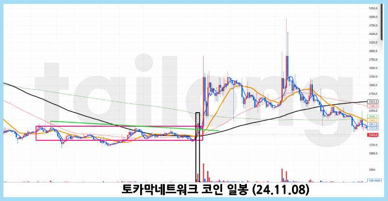 위 차트는 토카막네트워크 24년 11월 8일 기준 일봉 차트입니다. 분홍색 박스권, 초록색 하락추세선을 상향돌파하며 거래량이 급증한 것이 확인될 거에요. 그리고 다음 캔들이 음봉이긴하지만 단봉으로 5이평 위에 종가가 유지되면서 재차 상승을 했죠.