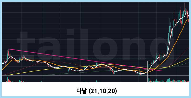 위 차트는 다날 21년 10월 20일 기준 일봉 차트입니다. 분홍색 하락추세선을 상향돌파하며 거래량이 급증하였고, 이후 상승추세가 지속되었습니다.