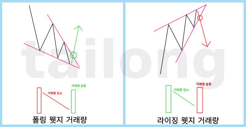 중요한 것은 삼각수렴과 유사하게 웻지 패턴에서도 가격이 수렴하면서 '거래량도 줄어든'다는 것입니다. 그런 후 반전된 추세대로 거래량이 크게 증가하죠.