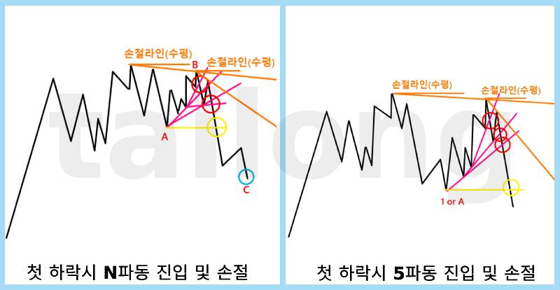 위 그림 좌측) 은 최고점 기준 첫 하락시 ABC 조정파동(N파동, 3파동)으로 반락한 예입니다. 이럴 경우 반락이 위 그림 우측) 에 비해 강하지 않아요. 3파 하락과 5파 하락을 비교해 보면 5파 하락이 2개의 파동이 더 있기 때문에 강력한 편입니다.