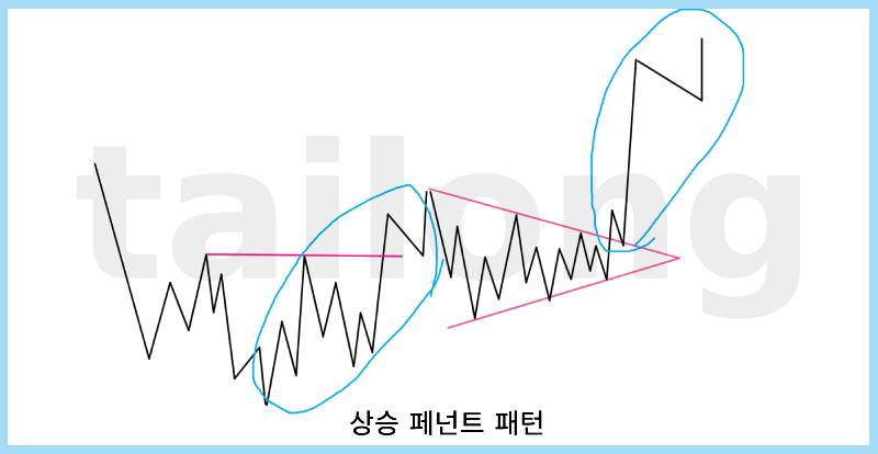 위 그림) 과 같이 삼각수렴 후 이전 상승분만큼 상승하는 상승 페넌트 페턴이 연이어 나올 수 있습니다.