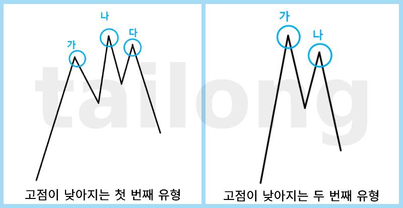 더블 탑, 즉 고점이 낮아지는 쌍봉의 경우도 개대 위의 두 가지 유형을 벗어나지 않아요.