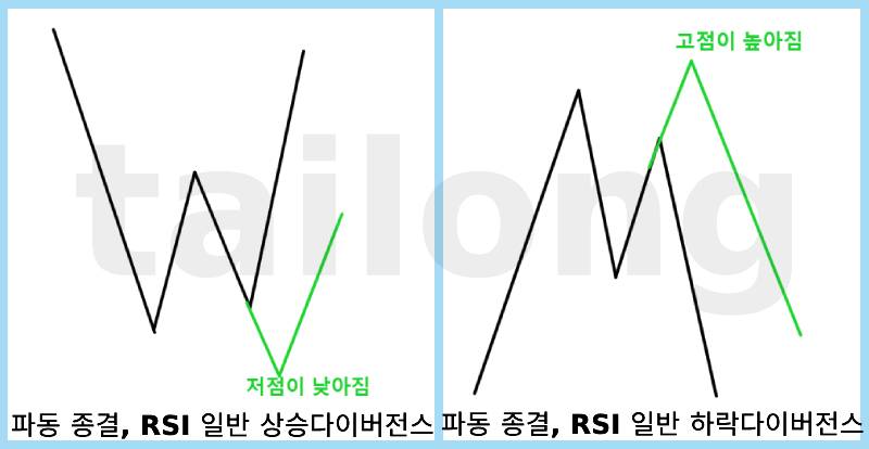 위 그림 좌측) 과 위 그림 우측) 모두 주황색으로 표시한 영역은 생략되기도 해요. 저점이 낮아지는 단계를 통해 파동 종결을 확인하고, RSI 일반 상승다이버전스 또한 확인되면 좋지만 그렇지 않더라도 위 그림 좌, 우) 에서 확인할 수 있는 저점이 높아지는 단계를 확인하면 매매를 할 수 있습니다.