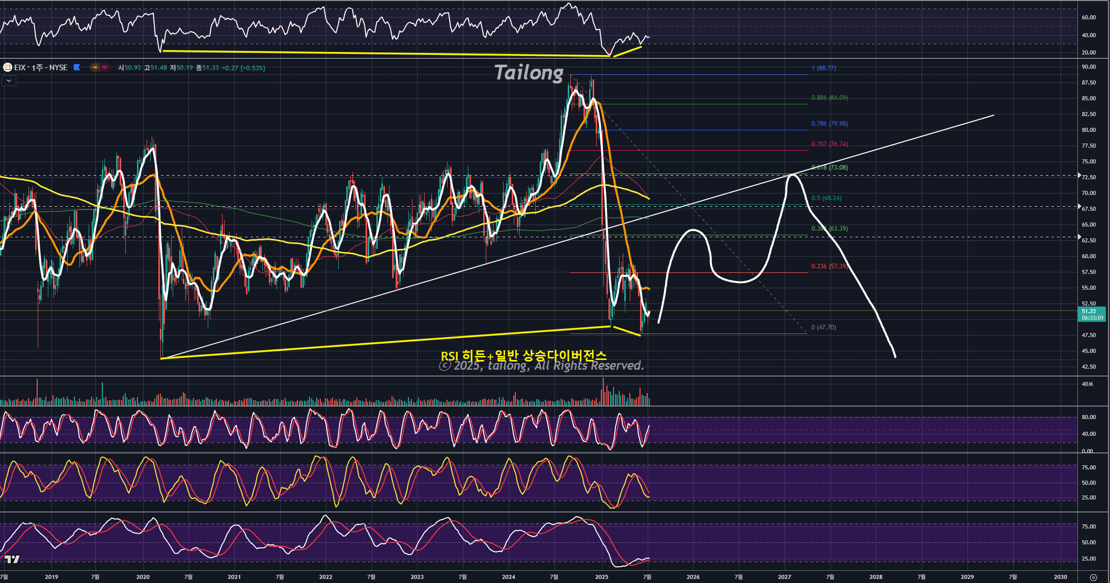 EIX 주봉차트를 보면, 주봉상 RSI 히든+일반 상승다이버전스가 보입니다.
