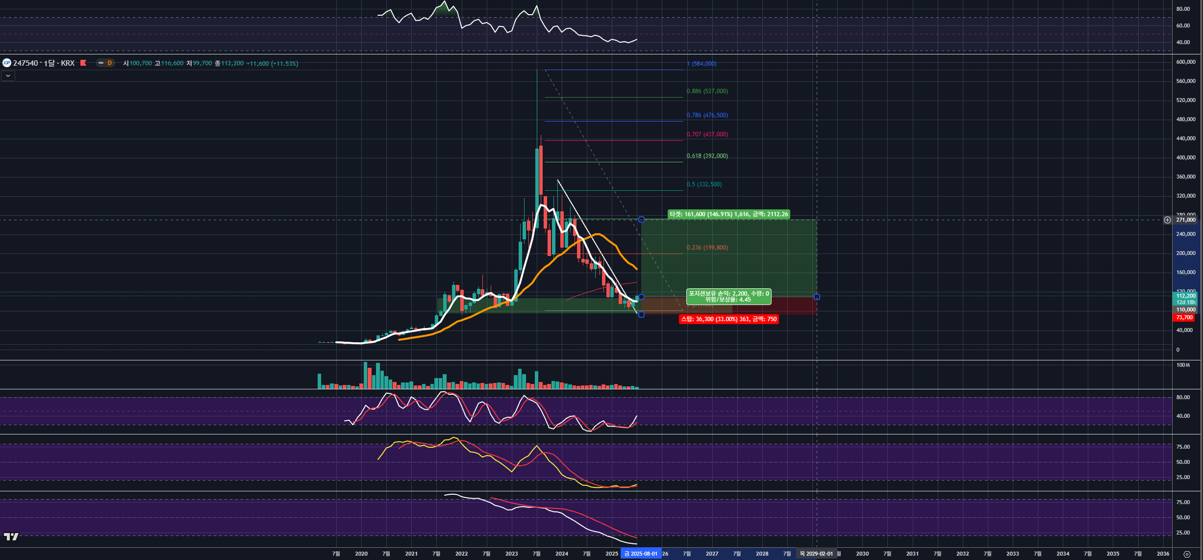 2차 전지 테마주들의 월봉을 보면, 월봉상 단기 이평과 중장기 이평간의 이격이 크므로, 중장기 이평에 맞게 가격이 반등하며 이격 또한 해소할 것으로 보입니다. 2차 전지 관련주들은 이미 모두 상당히 오랜 기간, 상당히 많은 하락을 한 후 상승준비 중입니다. 또한 이에 걸맞는 호재료도 나오고 있고요. 그러므로 나스닥의 상승, 하락과 별개로 2차 전지주는 25년 하반기와 26년 상반기 상승이 유력한 테마로 보이네요.