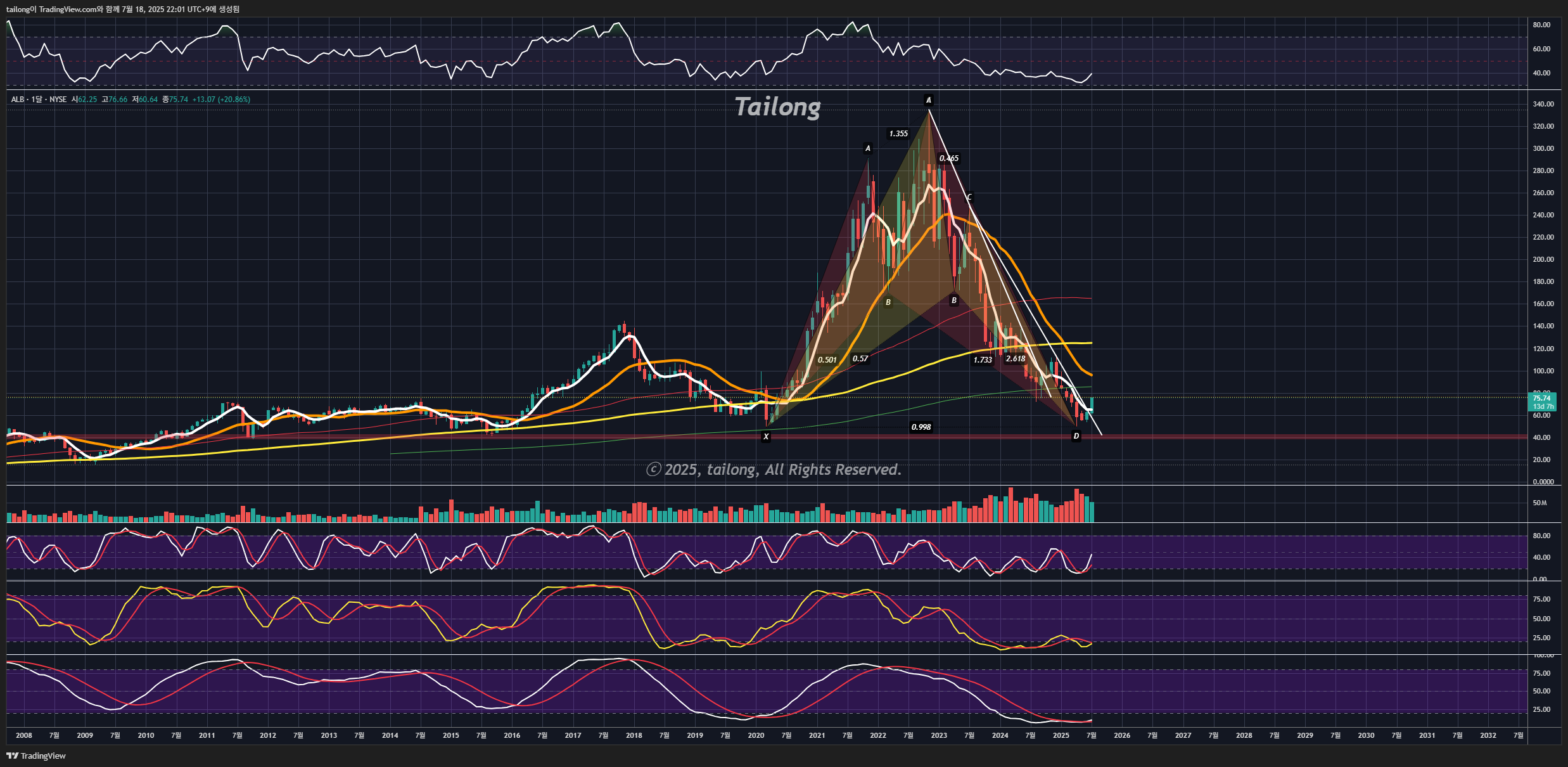 위 차트는 ALB 월봉 차트입니다. 월봉상 노란색 Bullish Bat Pattern과 빨간색 Bullish Shark Pattern의 PRZ,
