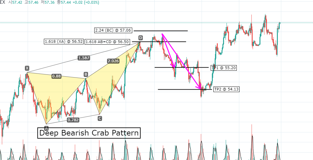 위의 딥 크랩 패턴(Deep Crab Pattern)의 구성요소에서 1.272가 중요하다고 하였으나, 사용해보니 1 / 1.272 / 1.618 모두 나올 수 있는 것 같습니다. 그래도 딥 크랩 패턴(Deep Crab Pattern)은 1.272에서 신뢰도를 얻을 수 있다고 보면 될 것 같습니다.