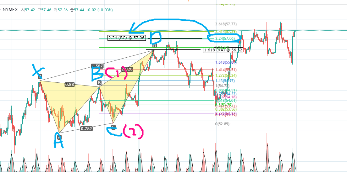 위의 차트에서 C 포인트는 0.786 (AB)가 나왔습니다. 0.382 ~ 0.886의 범위 안에 있기에 C 포인트 값을 충족했다고 볼 수 있습니다.