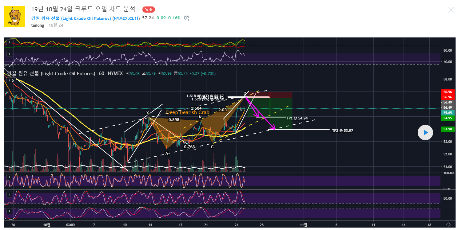 위의 차트는 크루드 오일 19년 10월 초~11월까지의 현재 차트 1시간 봉입니다.
