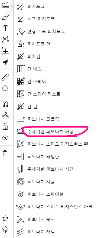 트레이딩 뷰 좌측에 피보나치 확장 도구(fibonacci extension tool)를 활용하여 Alternate AB=CD를 측정합니다.
