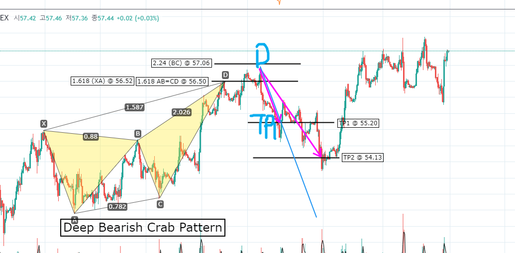 위의 딥 크랩 패턴(Deep Crab Pattern)의 구성요소에서 1.272가 중요하다고 하였으나, 사용해보니 1 / 1.272 / 1.618 모두 나올 수 있는 것 같습니다. 그래도 딥 크랩 패턴(Deep Crab Pattern)은 1.272에서 신뢰도를 얻을 수 있다고 보면 될 것 같습니다.
