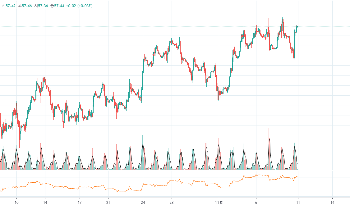 위의 차트는 크루드 오일 19년 10월 초~11월까지의 현재 차트 1시간 봉입니다.