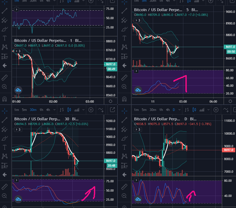 좌측 상단 1분봉, 우측 상단 5분 봉, 좌측 하단 30분 봉, 우측 하단 1일 봉 모두