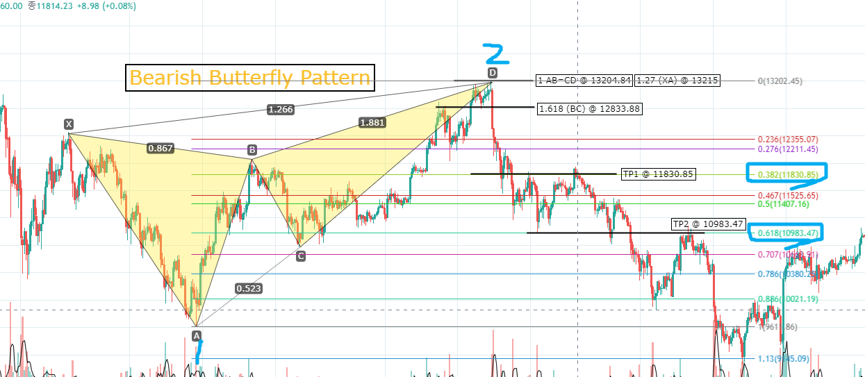 위의 완벽한 패턴에서도 보듯, 0.786B포인트와 1.27D포인트가 나비 패턴(Butterfly Pattern)에서 가장 중요합니다.