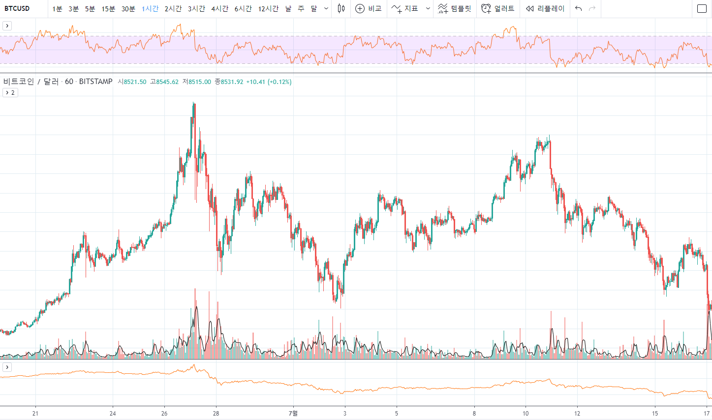 위의 차트는 비트코인 2019년 6월~7월의 차트입니다.