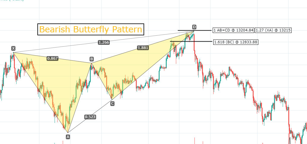 아래는 Harmonic trading volume.1에 나온 매도 나비 패턴(Bearish Butterfly Pattern)예시입니다.