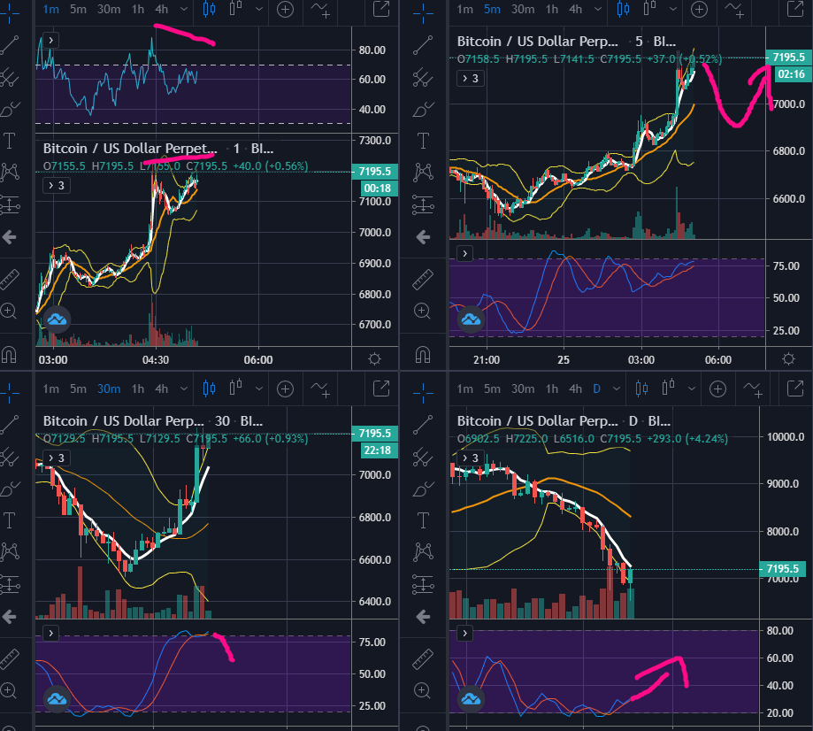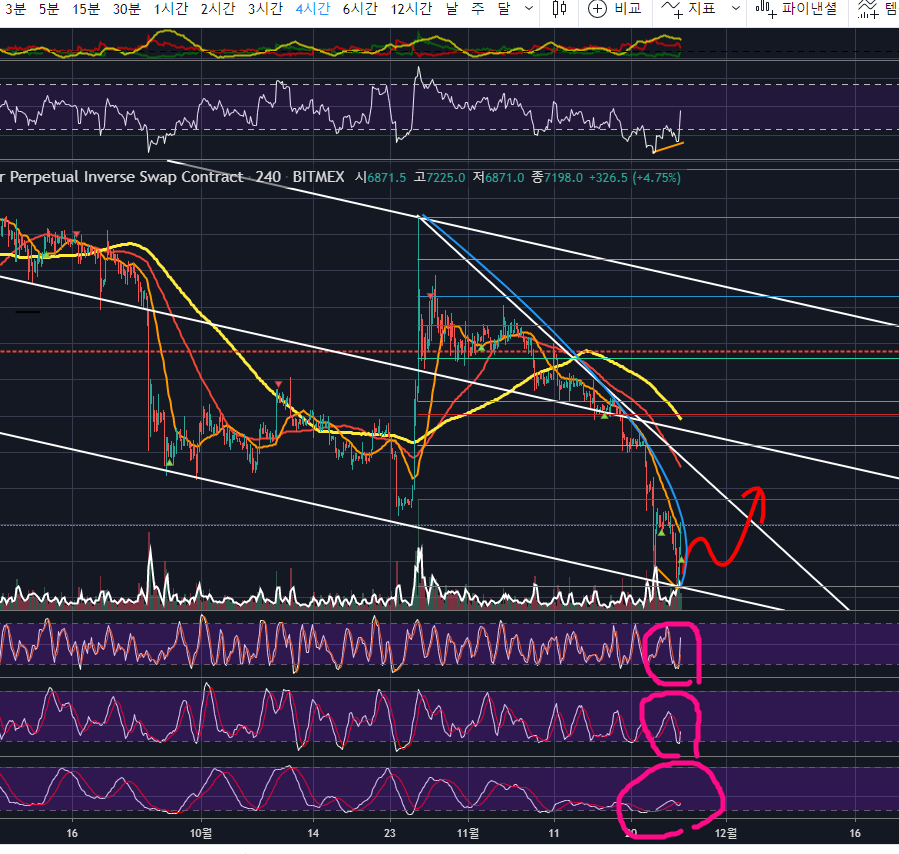 1일 봉, 4시간 봉, 1시간 봉, 30분 봉, 15분 봉, 5분 봉, 3분 봉, 1분 봉 모두 일반 상승 다이버전스가 컨펌되며 강한 반등이 나왔습니다. 6500부터 7200까지 반나절도 지나지 않았는데 상승했네요.