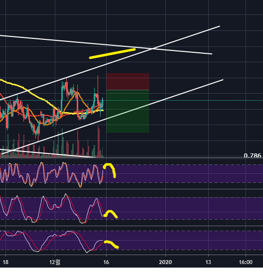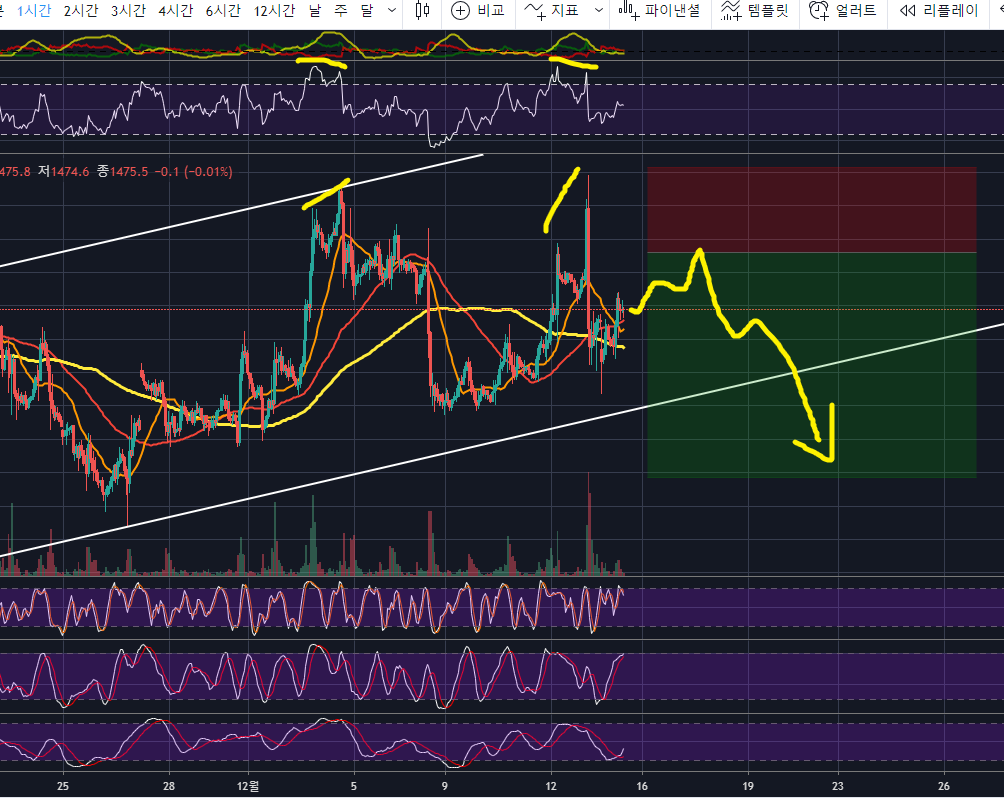 1시간 봉을 보면 상승 후 저항을 맞고서 강한 하락을 할 것 같습니다.
