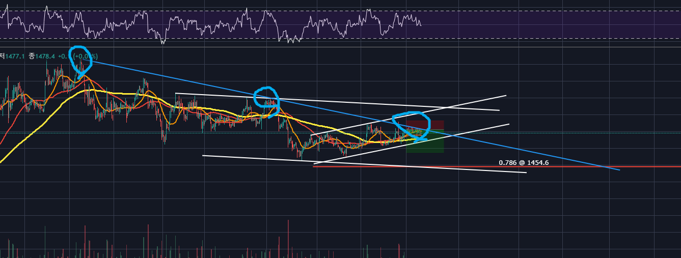 만약 저 파란색 우하향 추세선을 강하게 돌파한다면,