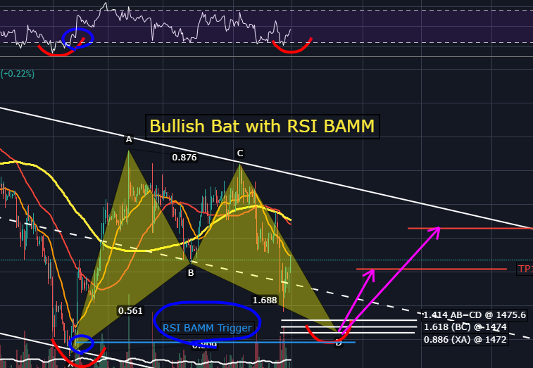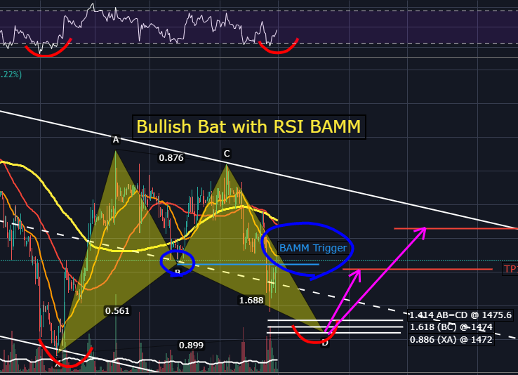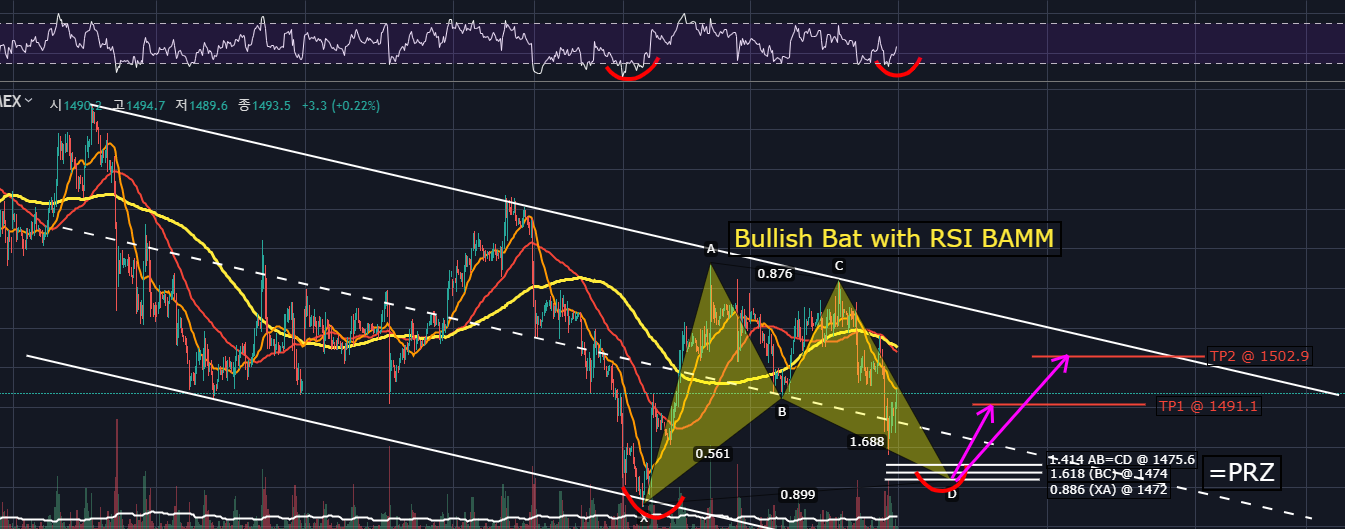 Bullish Bat pattern과 BAMM Trigger, RSI BAMM Trigger가 모두 발생하여 PRZ인 1472부근에서 지지 후 반등하게 된다면 D지점에서 RSI 일반 상승다이버전스까지 나타나며 TP1~TP2까지의 상승을 기대해볼 수 있습니다.