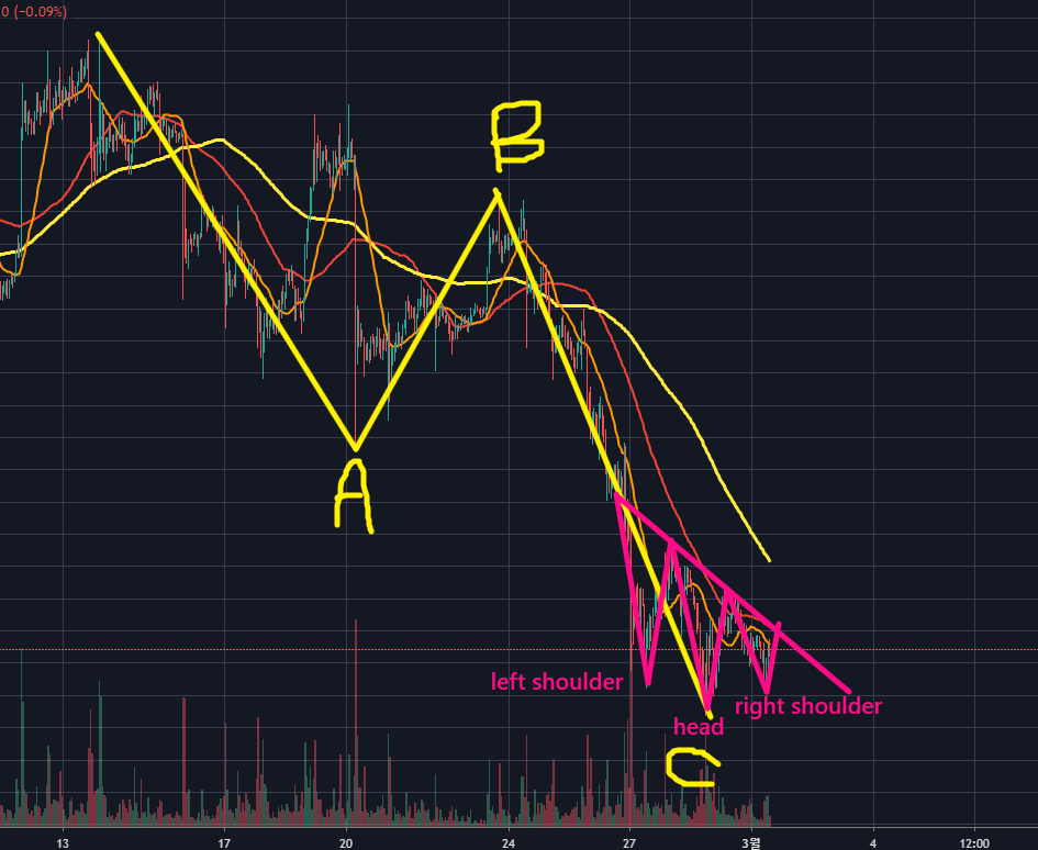 현재는 조정 C-5파가 나오면서 3파가 left shoulder/5파가 head/ 상승 1파 or A파가 right shoulder가 나온것을 확인할 수 있습니다.