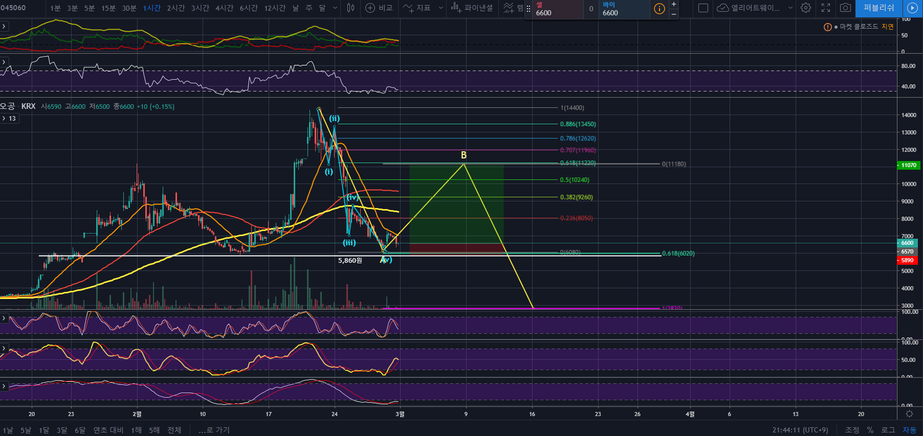 B파 반등은 0.618자리인 11220정도가 될 것 같으며, 이는 2월 3일의 고점입니다.