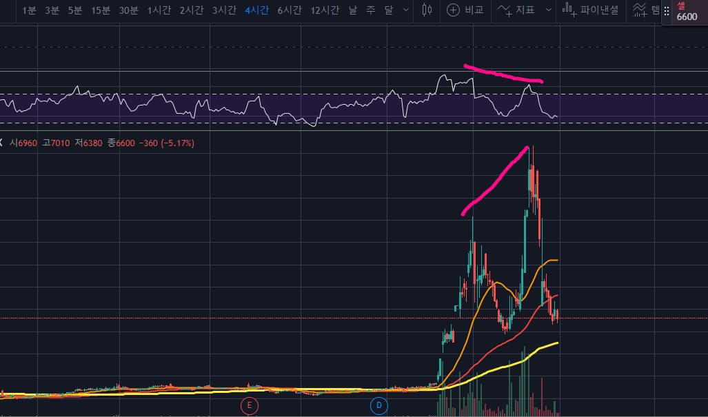고점간에 4시간 봉 일반 하락 다이버전스 컨펌되었고,
