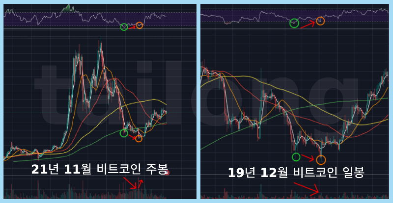 위 그림 좌측은 21년 11월 비트코인 주봉 차트입니다. 앞에 RSI 히든 상승다이버전스가 있지만, 이것을 제외하더라도 RSI 일반 상승다이버전스가 주봉에서 적용된 후 상승반전한 것이 보일거에요. 여기에서는 우측 저점을 갱신한 캔들에서 거래량이 증가하였습니다. 이는 하락하는 거래량과 + 반등하는 거래량이 합쳐졌기에 거래량이 증가한 것으로 보이는 것입니다.