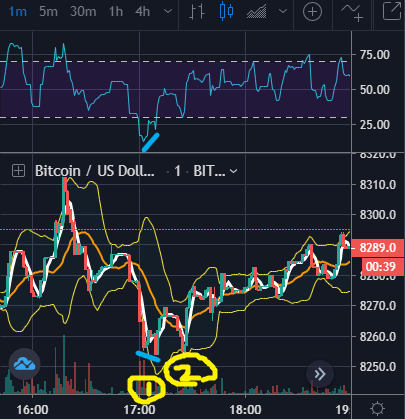 30분 봉의 RSI 일반 상승다이버전스로 추세가 전환되려면 5분 봉의 RSI 일반 상승다이버전스가 두 번 필요하고, 1분 봉의 RSI 일반 상승다이버전스가 네 번은 필요한 게 제가 지금까지 기술적분석으로 매매하며 경험한 현상입니다. 그래서 이 것을 일반적인 현상으로 봅니다. 때에 따라 5분 봉 RSI 일반 상승다이버전스를 만들 때 1분 봉 RSI 일반 상승다이버전스가 2회가 아니라 1회 나올 수도 있습니다. 다만, 높은 타임프레임의 RSI 일반 상승다이버전스가 나오는 두 지점은, 각 지점당 더 낮은 타임프레임의 RSI 일반 상승다이버전스인 경우가 경험상 많다는 것입니다.