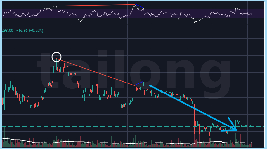 위 사진 또한 가격의 고점은 높아지고, RSI의 고점은 낮아지며 거래량이 감소하였습니다.