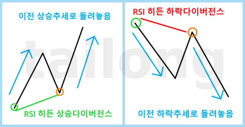 그래서 위 그림과 같이 RSI 일반 다이버전스와 RSI 히든 다이버전스를 결합해서 사용할 수 있습니다.