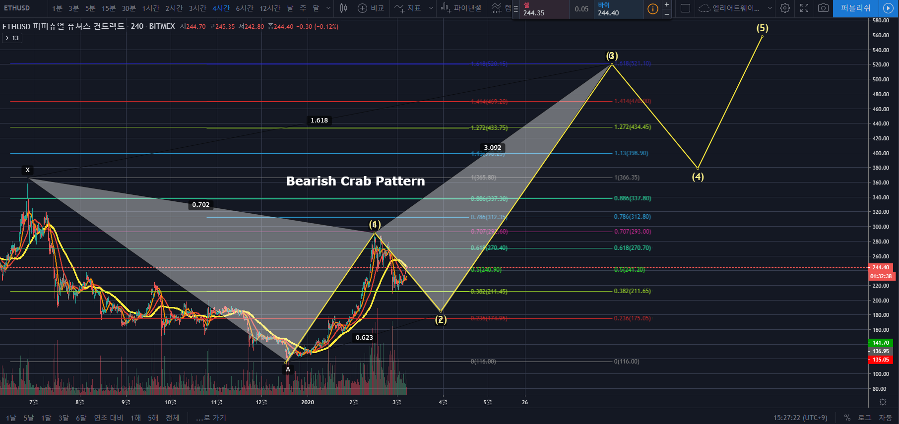 그렇기에 약반등 하고 있는 지금의 상승은 조만간 주춤할 것이며, 2파 지점이며 Bearish Crab Pattern의 C값에 해당하는 부근까지 조정이 이루어질 것으로 보여집니다.