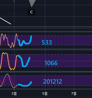 하지만 533은 데드크로스 후 하락하고 있기에 조정이 시작되었으며,