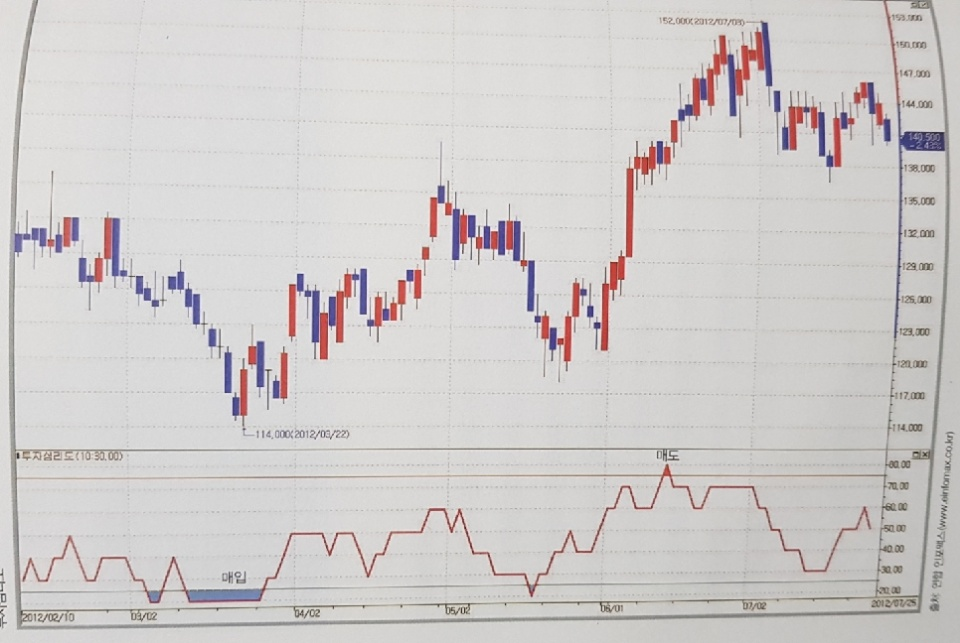 위의 그림대로 투자심리도 매매방법은 과매도일 때 매수, 과매수일 때 매도인 것입니다.
