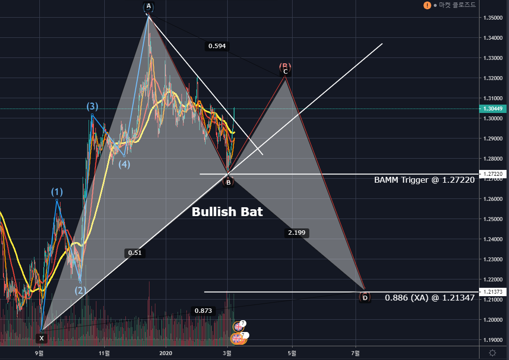 Bullish Bat Pattern의 B포인트를 지나면서 BAMM Trigger가 발동되며 PRZ인 0.886 (XA)까지 하락할 것 같습니다.