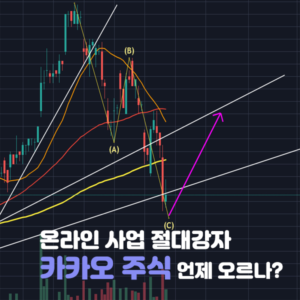 카카오 차트를 보면, 현재 고점을 갱신한 후 엘리엇웨이브 ABC조정을 마친 것으로 보입니다.