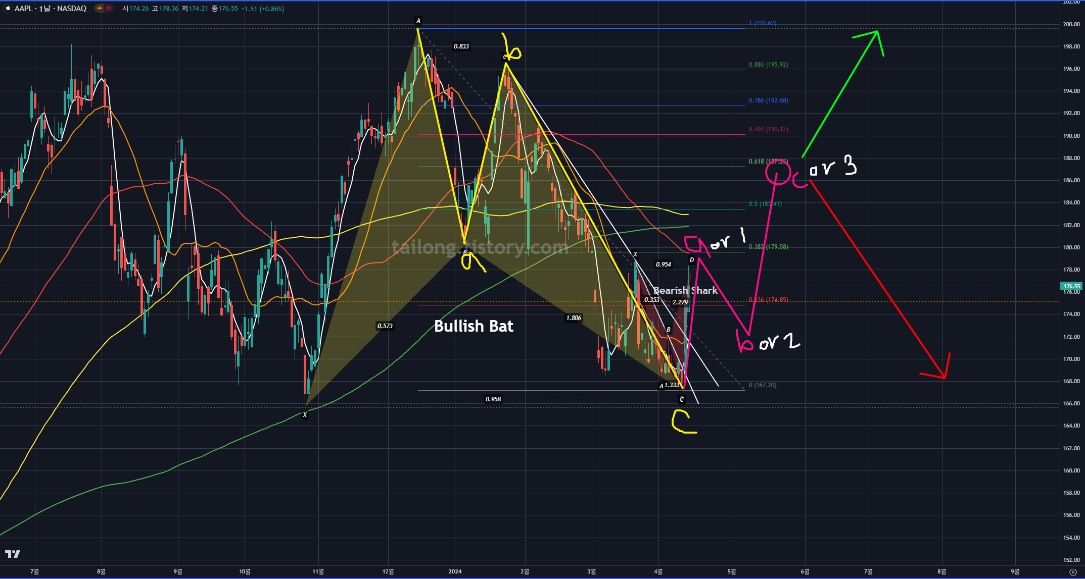 24년 4월 15일 현재, 과거 작도해둔 차트대로 본다면 애플은 반등 후 일봉상 저점을 갱신해서 위와 같이 상승한 모습입니다.