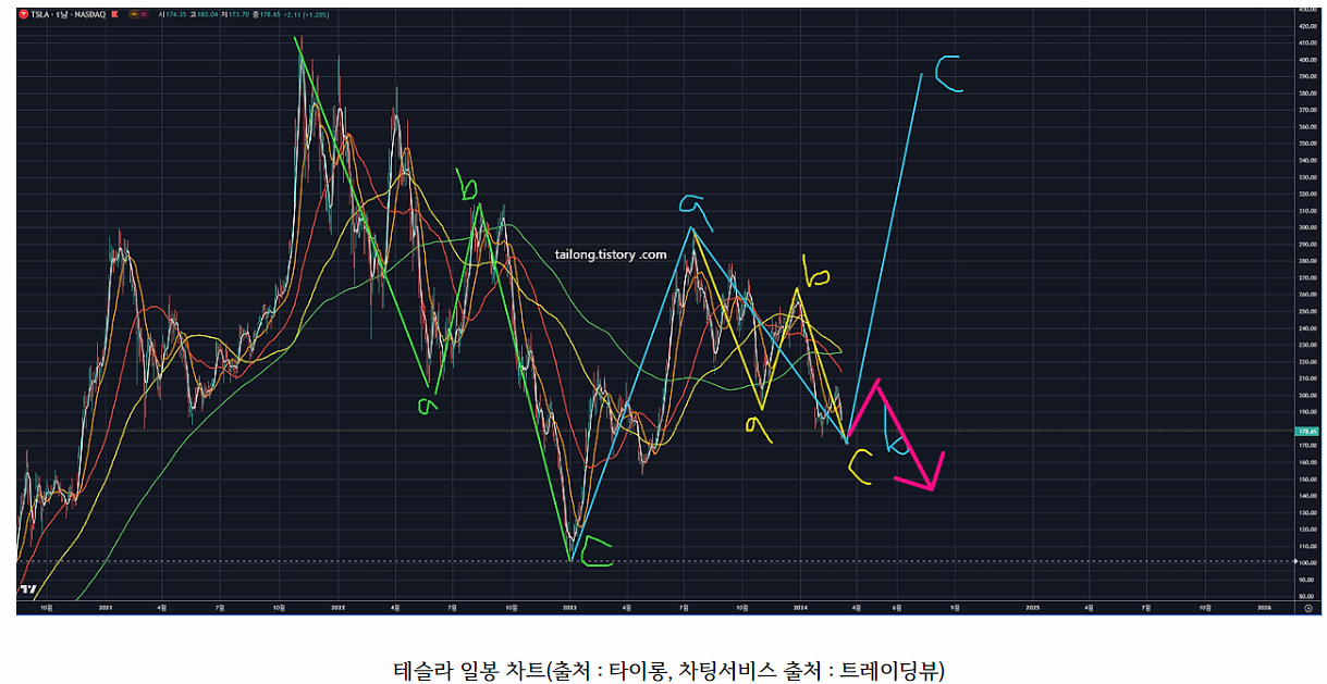 위 그림은 3월 8일 분석에서 올린 테슬라 차트입니다. 해당 과거 차트에서, 분홍색대로 정상반전은 이루어졌지만, 다시 하락해있는 상태입니다. 노란색 ABC 조정파동에서 C파의 길이가 상대적으로 짧아서 비율이 좋지 않았는데, 금번 반등 후 추가하락으로 인하여 비율을 충족한 모습이에요.