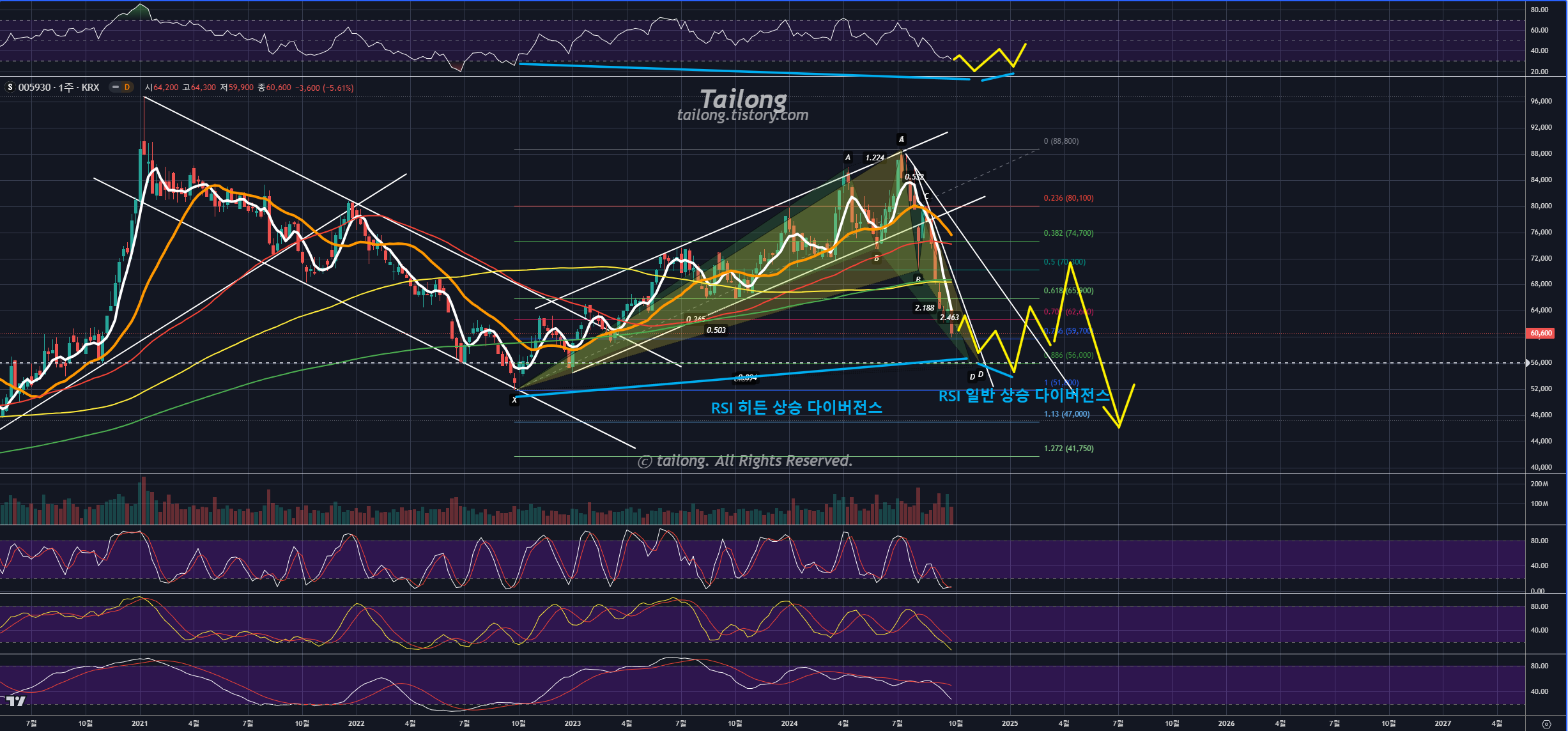 이렇게 된다면 삼성전자는 주봉상 Bullish Shark, Bullish Bat, RSI 히든+일반 상승다이버전스 조합으로 강한 반등을 할 것 같아요.
